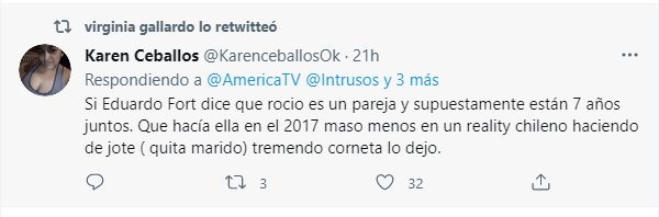 En este contexto, la panelista de Intrusos compartió en sus redes sociales un durísimo tweet de una usuaria que duda de la fidelidad de Rocío en su vínculo con Eduardo y hace referencia a su pasado en la televisión. "Si Eduardo Fort dice que Rocío es su pareja y supuestamente están hace 7 años juntos, ¿qué hacía ella en 2017 en un reality chileno haciendo de jote (quita marido)? Tremendo corneta lo dejó", fue el mensaje que compartió Gallardo.