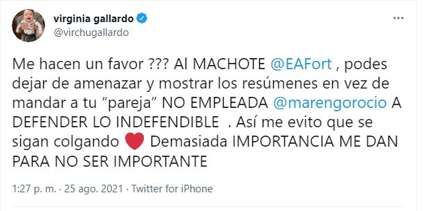A lo que Gallardo respondió: "¿Me hacen un favor ? Al MACHOTE Eduardo, podes dejar de amenazar y mostrar los resúmenes en vez de mandar a tu “pareja” NO EMPLEADA Marengo A DEFENDER LO INDEFENDIBLE . Así me evito que se sigan colgando Demasiada IMPORTANCIA ME DAN PARA NO SER IMPORTANTE", publicó en la red del pajarito.