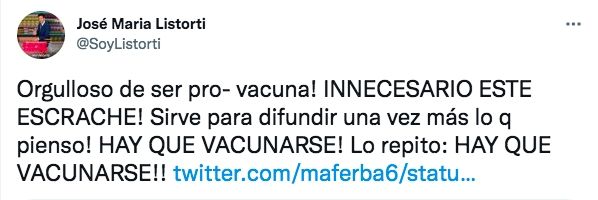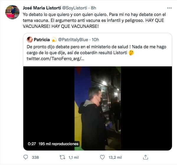 "De pronto dijo debate pero en el ministerio de salud ! Nada de me hago cargo de lo que dije, así de cobardín resultó Listorti", escribió la usuaria que publicó el video. Rápidamente, Listorti replicó el tuit y respondió: "Yo debato lo que quiero y con quien quiero. Para mi no hay debate con el tema vacuna. El argumento anti vacuna es infantil y peligroso. HAY QUE VACUNARSE! HAY QUE VACUNARSE!".
