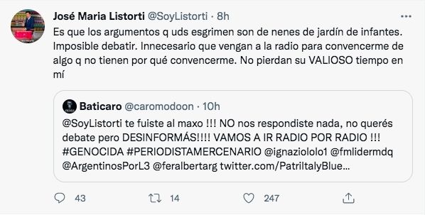 "Te fuiste al mazo. NO nos respondiste nada, no querés debate pero desinformas. Vamos a ir radio por radio. Genocida. Periodista mercenario", lo atacó otro usuario al ver el video, y Listorti respondió: "Es que los argumentos que ustedes esgrimen son de nenes de jardín de infantes. Imposible debatir. Innecesario que vengan a la radio para convencerme de algo que no tienen por qué convencerme. No pierdan su VALIOSO tiempo en mí".
