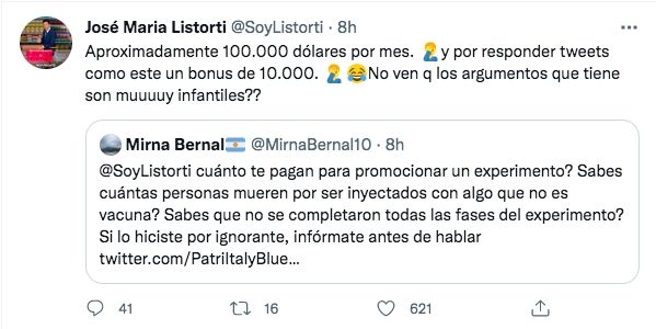"¿Cuánto te pagan para promocionar un experimento? ¿Sabes cuántas personas mueren por ser inyectados con algo que no es vacuna? ¿Sabes que no se completaron todas las fases del experimento? Si lo hiciste por ignorante, infórmate antes de hablar", lo increpó otro. "Aproximadamente 100.000 dólares por mes. Y por responder tweets como este un bonus de 10.000", lanzó con su característico humor. "¿No ven que los argumentos que tiene son muuuuy infantiles?", respondió con ironía.