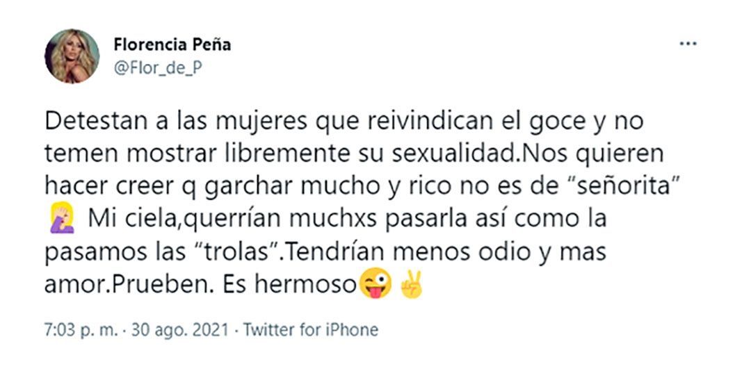 Tras la polémica por las declaraciones, Flor Peña salió a defender a la precandidata a diputada. “Detestan a las mujeres que reivindican el goce y no temen mostrar libremente su sexualidad. Nos quieren hacer creer que garchar mucho y rico no es de ‘señorita’. Mi ciela, querrían muchxs pasarla así como la pasamos las ‘trolas’. Tendrían menos odio y mas amor. Prueben. Es hermoso”, escribió la actriz en su cuenta de Twitter.