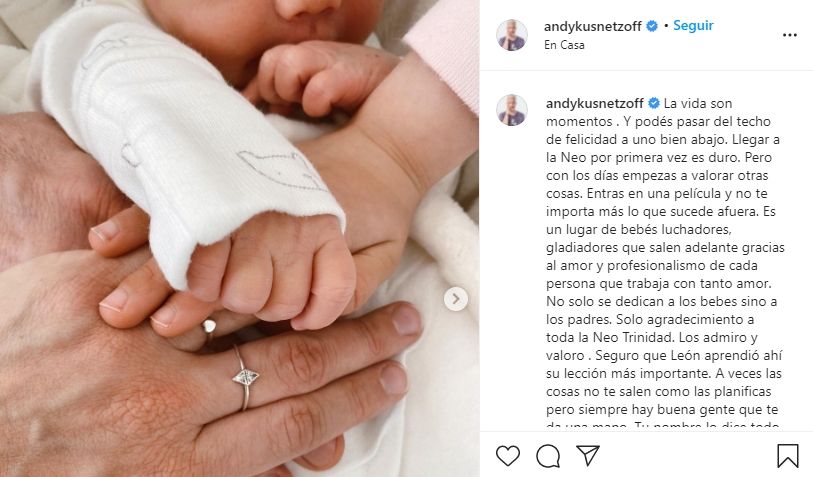 Andy Kusnetzoff fue papá de su segundo hijo el pasado 20 de agosto. El fin de semana, publicó un emotivo posteo en relación a la llegada de León, una vez que llegó a casa tras pasar varios días Neonatología.