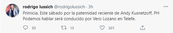 La persona que reemplazará al conductor será Vero Lozano. Así lo confirmó el periodista Rodrigo Lussich desde su cuenta de Twitter. "Primicia. Este sábado por la paternidad reciente de Andy Kusnetzoff, PH Podemos Hablar será conducido por Vero Lozano en Telefe".