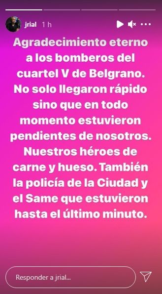 Luego, continuo: "Agradecimiento eterno a los bomberos del cuartel V de Belgrano. No solo llegaron rápido sino que en todo momento estuvieron pendientes de nosotros. Nuestros héroes de carne y hueso. También la policía de la Ciudad y el Same que estuvieron hasta el último minuto", indicó.