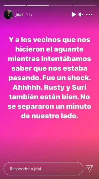 "Y a los vecinos que nos hicieron el aguante mientras intentábamos saber que nos estaba pasando. Fue un shock. Ahhhh. Rusty y Suri -sus perros- también están bien. No se separaron u minuto de nuestro lado", sumó Rial.