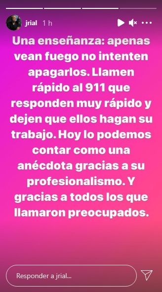 Por último, Rial reflexionó tras el hecho que pudo haber sido una tragedia: "Una enseñanza: apenas vean fuego no intenten apagarlos. Llamen rápido al 911 que responden muy rápido y dejen que ellos hagan su trabajo. Hoy lo podemos contar como una anécdota gracias a su profesionalismo. Y gracias a todos los que llamaron preocupados".