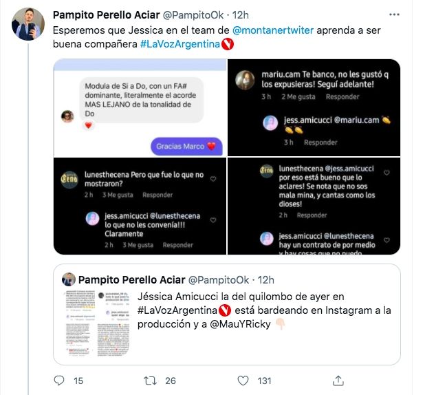 La polémica no terminó en los estudios de Telefe, rápidamente se traslado a las redes sociales. Fue el periodista Pampito Perello Aciar quien publicó en Twitter algunas capturas de pantalla de los comentarios de Jéssica en su cuenta personal. Hasta reaccionó Montaner, su actual coach.