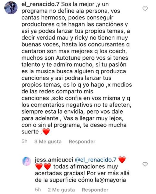 Cuando un seguidor le comentó que "Mau y Ricky no tienen muy buenas voces, hasta los concursantes que cantaron son más mejores que los coach, muchos con auto tune, pero vos si tenés talento. Que los comentarios negativos no te afecten, siempre está la envidia", Jéssica respondió: "Todas afirmaciones muy acertadas. Gracias por ver más allá de la superficie como la mayoría".
