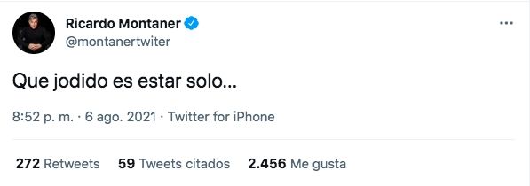 Desde su cuenta de Twitter, Montaner manifestó su descontento. "Que jodido es estar solo, esta cuarentena eterna", publicó.