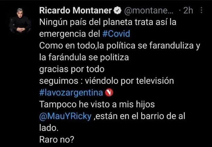 Y luego se refirió directamente a las medidas que tomó el Gobierno Nacional: "Ningún país del planeta trata así la emergencia del coronavirus. Como en todo, la política se faranduliza y la farándula se politiza. Gracias por todo. Seguimos viendo por televisión La Voz Argentina. Tampoco he visto a mis hijos Mau y Ricky que están en el barrio de al lado. ¿Raro, no?", concluyó.