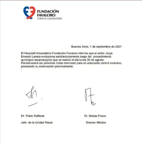 "El Hospital Universitario Fundación Favaloro informa que el señor Jorge Ernesto Lanata evoluciona satisfactoriamente luego del procedimiento quirúrgico laparoscópico que se realizó el día 30 de agosto. Permanecerá las próximas horas internado para un adecuado control evolutivo, planeando su externación próximamente", confirmaron en el último parte médico.