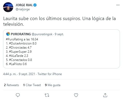 Ahora, tras el inminente final, la cosa parece que cambió y Jorge Rial lo hizo notar en su cuenta de Twitter. El ex conductor de Intrusos compartió que el programa había aumentado sus números con un ácido comentario. "Laurita sube con los últimos suspiros, una lógica de la televisión", redactó el periodista.