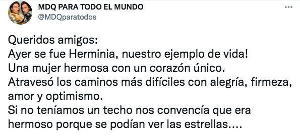 "Queridos amigos: ayer se fue Herminia, nuestro ejemplo de vida. Una mujer hermosa con un corazón único. Atravesó los caminos más difíciles con alegría, firmeza, amor y optimismo. Si no teníamos un techo nos convencía que era hermoso porque se podían ver las estrellas....y como siempre, tenía razón", comunicaron los hermanos a través de las redes sociales.