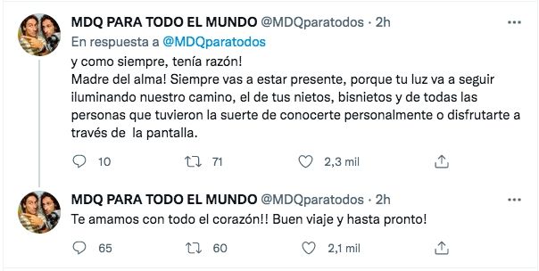 "Madre del alma. Siempre vas a estar presente, porque tu luz va a seguir iluminando nuestro camino, el de tus nietos, bisnietos y de todas las personas que tuvieron la suerte de conocerte personalmente o disfrutarte a través de la pantalla. Te amamos con todo el corazón!! Buen viaje y hasta pronto", finalizaron en el emotivo comunicado.