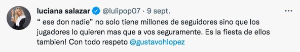 Ante las repercusiones de sus declaraciones, sorpresivamente Luciana Salazar entró en escena y le pegó duro desde su cuenta de Twitter. "Ese don nadie no solo tiene millones de seguidores sino que los jugadores lo quieren más que a vos seguramente. Es la fiesta de ellos también! Con todo respeto @gustavohlopez", comentó la mediática sin pelos en la lengua.
