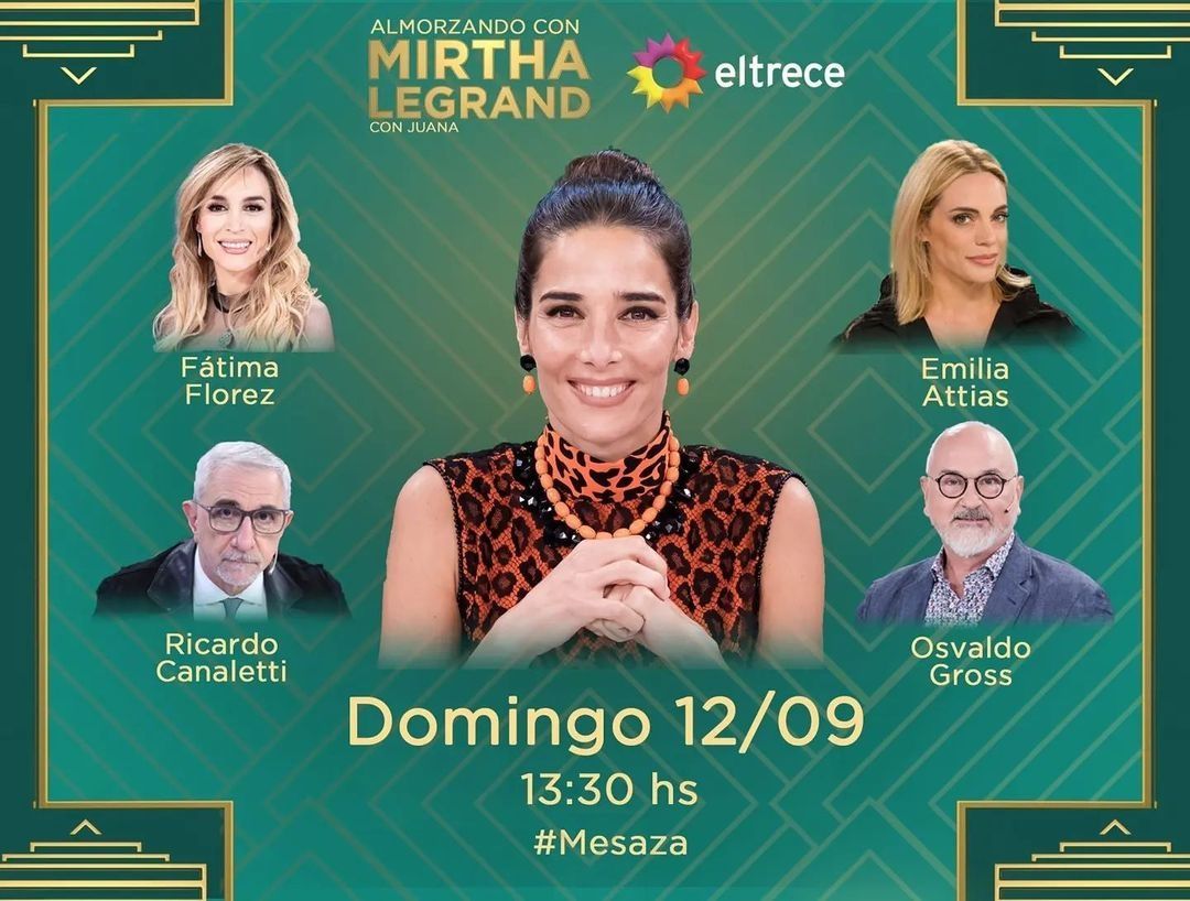 Además, el domingo al mediodía los invitados a Almorzando con Mirtha Legrand serán la actriz experta en imitaciones Fátima Flórez, quien hablará del emotivo homenaje a Gilda y dará un espectacular show con bailarines y música en vivo; el escritor y conductor Ricardo Canaletti; la actriz y conductora Emilia Attias; y el maestro pastelero Osvaldo Gross.