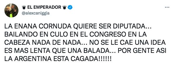 Tras las repercusiones, Alex Caniggia se mostró furioso con la candidatura de la bailarina y salió a criticarla sin ningún tipo de filtro. A través de su cuenta de Twitter, el mediático publicó un desagradable mensaje: "La enana cornuda quiere ser diputada… bailando en culo en el Congreso en la cabeza nada de nada. No se le cae una idea es más lenta que una balada… Por gente así la Argentina está cagada", escribió El Emperador.