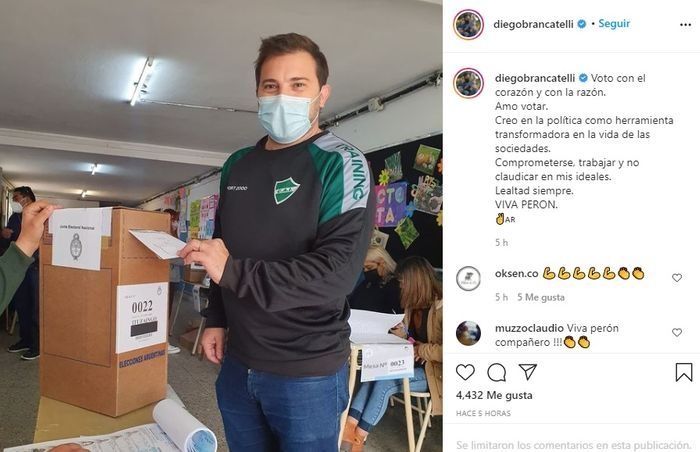 Diego Brancatelli cumplió con su deber cívico este domingo y compartió una imagen del momento en que votó en la locaalidad bonaerense de Ituzaingó. El integrante de Intratables (América) lanzó un efusivo mensaje a través de su cuenta de Instagram en el que ratificó su pasión por la política.