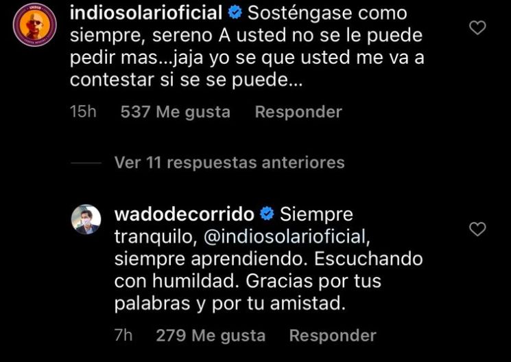 Rápidamente, De Pedro agradeció las palabras del artista: "Siempre tranquilo, Indio Solari, siempre aprendiendo. Escuchando con humildad. Gracias por tus palabras y por tu amistad", le contestó.