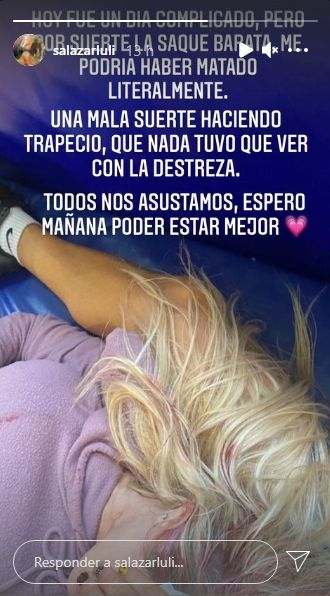 "Estaba en un trapecio, haciendo una inversión para abajo. Se le dio un poco más de impulso al trapecio y como yo estaba boca abajo fue tan fuerte el envión que me estrolé la cabeza contra la pared. Fue terrible", contó Luli a través de un audio que le envió al programa La previa de La Academia.
