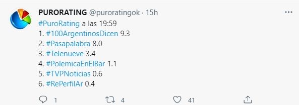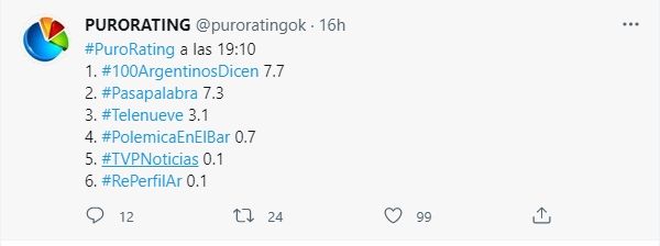 A las 18.46, Pasapalabra arrancaba con 7.4 ante los 7.0 de 100 argentinos dicen. Una ventaja a favor del programa de Telefe que se mantuvo hasta las 19:10, cundo el ciclo de eltrece tomó la punta y logró la máxima en audiencia. A las 19:28 ya marcaba 8.2 contra 7.3 de la competencia.
