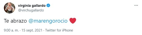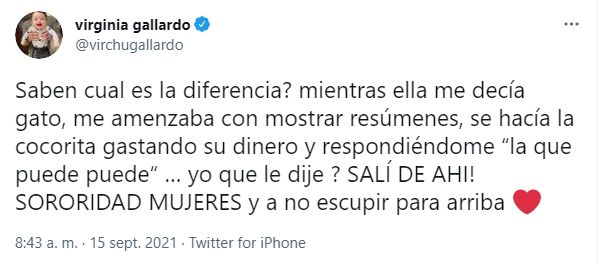"Saben cual es la diferencia? mientras ella me decía gato, me amenazaba con mostrar resúmenes, se hacía la cocorita gastando su dinero y respondiéndome "la que puede puede"… yo que le dije ? ¡SALÍ DE AHÍ! SORORIDAD MUJERES y a no escupir para arriba", fue el mensaje de Gallardo. Luego, publicó su apoyo a la mediática: "Te abrazo @marengorocio".