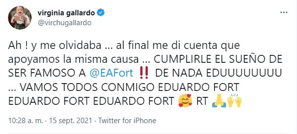 Para cerrar, decidió pegarle a con cierta ironía Eduardo: "Ah ! y me olvidaba … al final me di cuenta que apoyamos la misma causa … cumplirle el sueño de ser famoso a @EAFort. De nada Eduuuu... Vamos todos conmigo Eduardo Fort, Eduardo Fort, Eduardo Fort. RT".