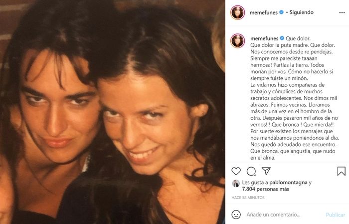 Su amiga Mercedes Funes publicó un desgarrador mensaje en la red dedicado a la artista. "Qué dolor. Qué dolor la pu... madre. Que dolor. Nos conocemos desde re pendejas. Siempre me pareciste taaaan hermosa! Partías la tierra. Todos morían por vos. Cómo no hacerlo si siempre fuiste un minón. La vida nos hizo compañeras de trabajo y cómplices de muchos secretos adolescentes. Nos dimos mil abrazos. Fuimos vecinas. Lloramos más de una vez en el hombro de la otra", comenzó Funes.
