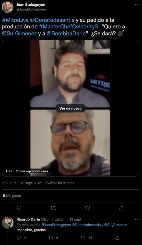 El chef Donato de Santis manifestó en una entrevita con Juan Etchegoyen en Mitre Live (Radio Mitre) que le gustaría tener a Susana Giménez y Ricardo Darín en el reality. El periodista replicó el pedido del chef en su cuenta de Twitter y mencionó al conocido actor, quien respondió de maanera categórica.