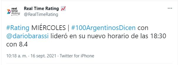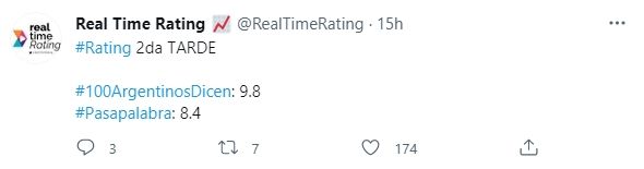 Este miércoles se llevó a cabo el tercer duelo por el rating entre Darío Barassi e Iván de Pineda. De acuerdo a los datos de la medidora Kantar Ibope Media el ganador fue 100 argentinos dicen(eltrece), quien obtuvo un pico máximo de audiencia de 9.8 contra los 8.4 de Pasapalabra (Telefe). De esta forma, el programa de entretenimientos de eltrece lideró la segunda tarde con un audiencia que promedió los 8.4 puntos.