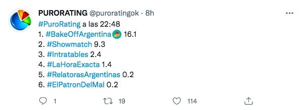 Recordemos que con MasterChef Celebrity o La Voz Argentina, la ficción extranjera no había logrado ubicarse en ese lugar de privilegio. Bake off descendió 4 puntos con respecto a su primera emisión y ocupó el segundo lugar entre lo más visto del martes.