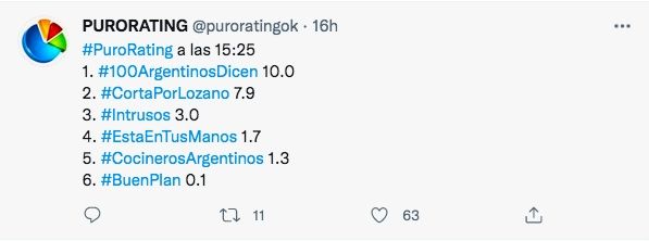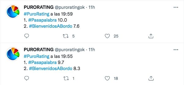 Pasapalabra (Telefe), con Iván de Pineda como líder, estuvo al frente en su franja con 10 puntos. Mientras que Bienvenidos a Bordo (El Trece), su competencia directa, obtuvo un máximo de 8.3 Previamente, en competencia, Guerra de Rosas (Telefe) aplastó a El Gran Premio de la Cocina (El Trece) con 9.9 ante los 5.8 que logró el ciclo liderado por Carina Zampini.