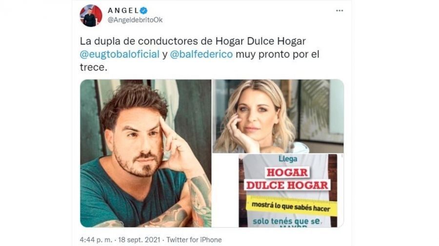 "La dupla de conductores de Hogar Dulce Hogar: Eugenia Tobal y Federico Bal. Muy pronto por El Trece", ratificó en Twitter Ángel de Brito.