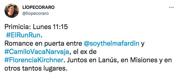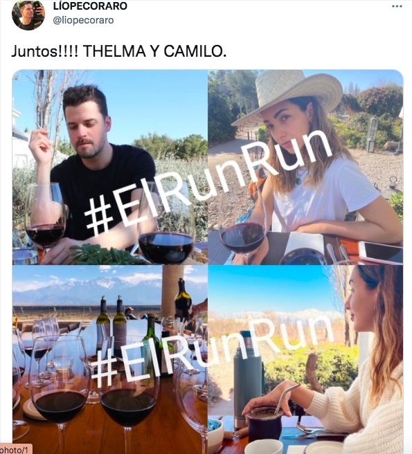 "Romance en puerta entre Thelma Fardín y Camilo Vaca Narvaja. Juntos en Lanús, Misiones y otros tantos lugares", anticipó el periodista Lio Pecoraro desde su cuenta de Twitter, sumando imágenes donde se los ve almorzando en una reconocida bodega.