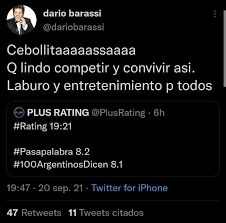 "Cebollitaaaaaa. Qué lindo competir y convivir así. Laburo y entretenimiento para todos", escribió Barassi luego de su programa obtuviera 8.1 puntos y Pasapalabra, 8.2. De todas formas, hay que destacar que los números están muy cercanos y para el conductor que se ha convertido en una de las figuras centrales de El Trece, es todo un desafío lograr una buena performance en su nuevo horario de la tarde.