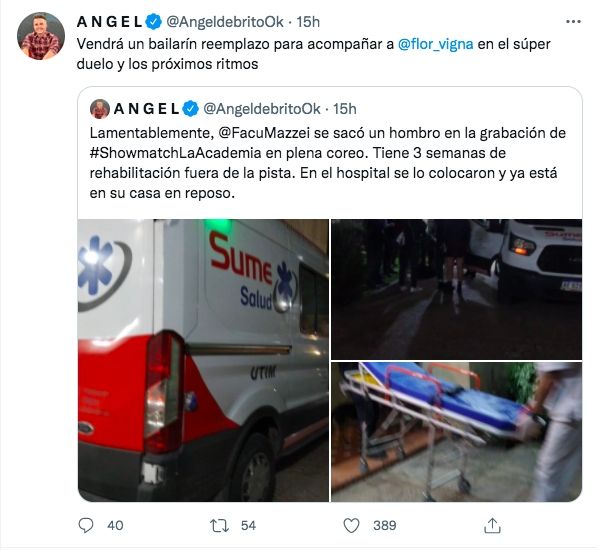 Fue Ángel de Brito quien informó en sus redes sociales del accidente que sufrió Mazzei. "Lamentablemente, @FacuMazzei se sacó un hombro en la grabación de #ShowmatchLaAcademia en plena coreo. Tiene 3 semanas de rehabilitación fuera de la pista. En el hospital se lo colocaron y ya está en su casa en reposo", indicó el jurado de La Academia.