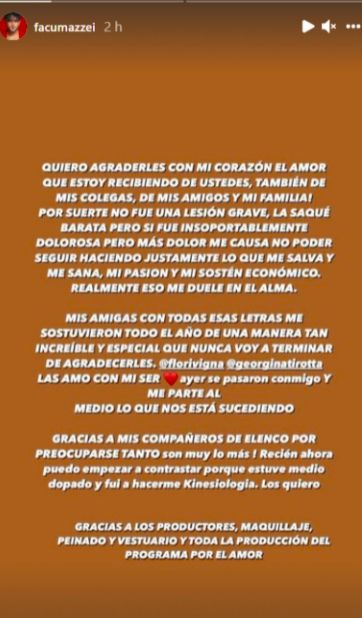 Fue Ángel de Brito quien informó con anterioridad en sus redes sociales del accidente que sufrió Mazzei. "Lamentablemente, @FacuMazzei se sacó un hombro en la grabación de #ShowmatchLaAcademia en plena coreo. Tiene 3 semanas de rehabilitación fuera de la pista. En el hospital se lo colocaron y ya está en su casa en reposo", indicó el jurado de La Academia.