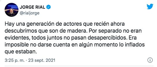 En este contexto, Jorge Rial también opinó desde su cuenta de Twitter sobre la ficción protagonizada por Agustina Cherri, Esteban Lamothe y Gonzalo Heredia. En relación al elenco, el periodista disparó: "Hay una generación de actores que recién ahora descubrimos que son de madera. Por separado no eran evidentes, todos juntos no pasan desapercibidos", escribió muy piante.