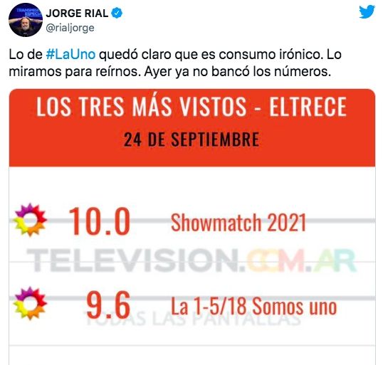 Luego, hizo un particular análisis sobre las mediciones de rating de la ficción: "Lo de #LaUno quedó claro que es consumo irónico. Lo miramos para reírnos. Ayer ya no bancó los números", comentó sobre la baja de audiencia que sufrió este viernes.