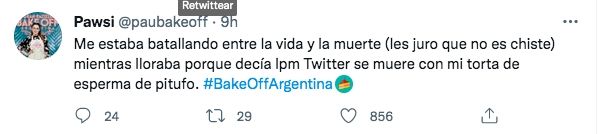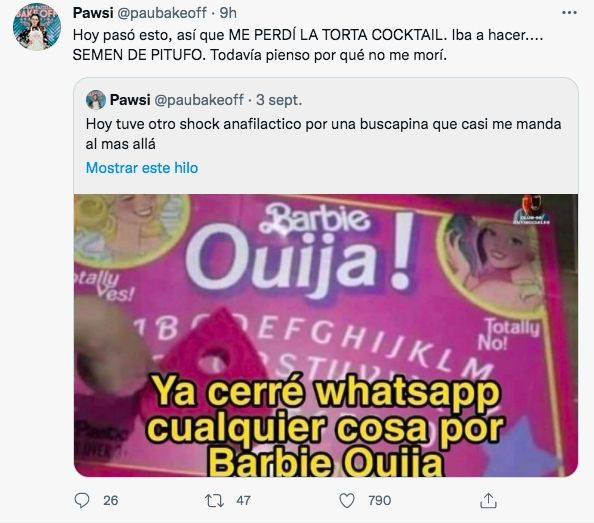 Tras el anuncio, la participante compartió en Twitter una publicación que había realizado el 3 de septiembre comentando: "Hoy tuve otro shock anafiláctico por una buscapina que casi me manda al más allá". Al recordar lo sucedido hace semanas atrás, le sumó un picante comentario. "Hoy pasó esto, así que ME PERDÍ LA TORTA COCKTAIL. Iba a hacer.... SEMEN DE PITUFO. Todavía pienso por qué no me morí", escribió Paula.