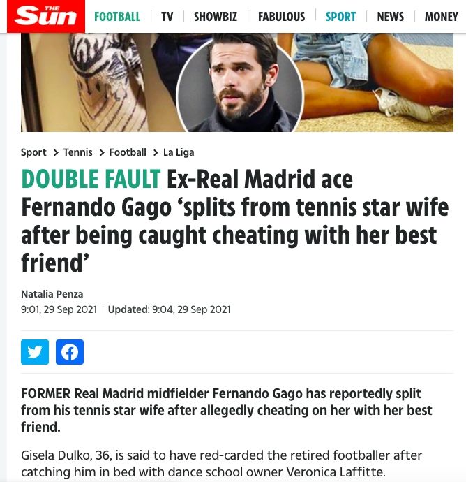 "DOUBLE FAULT. Ex-Real Madrid ace Fernando Gago ‘splits from tennis star wife after being caught cheating with her best friend’", tituló el diario The Sun, mencionando que el ex jugador fue descubierto "haciendo trampa" con la mejor amiga de su esposa.