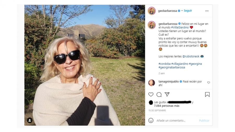 Por el momento, la actriz no hizo ningún anuncio sobre la propuesta que saldrá al aire por Telefe. De todas formas, dio un indicio durante sus días de descanso en Córdoba. "Feliz en mi lugar en el mundo Villa Giardino. ¿Ustedes tienen un lugar en el mundo? ¿Cuál es? Voy a extrañar pero vuelvo porque pronto les voy a contar muy buenas noticias que les van a encantar", expresó Georgina Barbarossa desde las sierras cordobesas.
