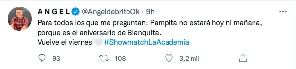 Anoche se produjo una baja importante en el jurado de La Academia de Showmatch. Minutos antes de que comenzara el programa, fue Ángel de Brito quien reveló la noticia en su cuenta de Twitter. "Sorpresas en el jurado! Te voy a extrañar hoy, Pampita", escribió el periodista.