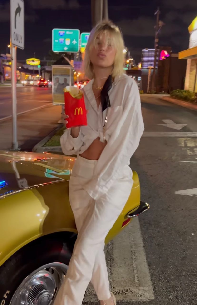 En las imágenes se los puede ver a los tres hombres de la familia tratando de empujar y hacer arrancar el auto, mientras Stefi mira de costado la situación comiendo papas fritas.