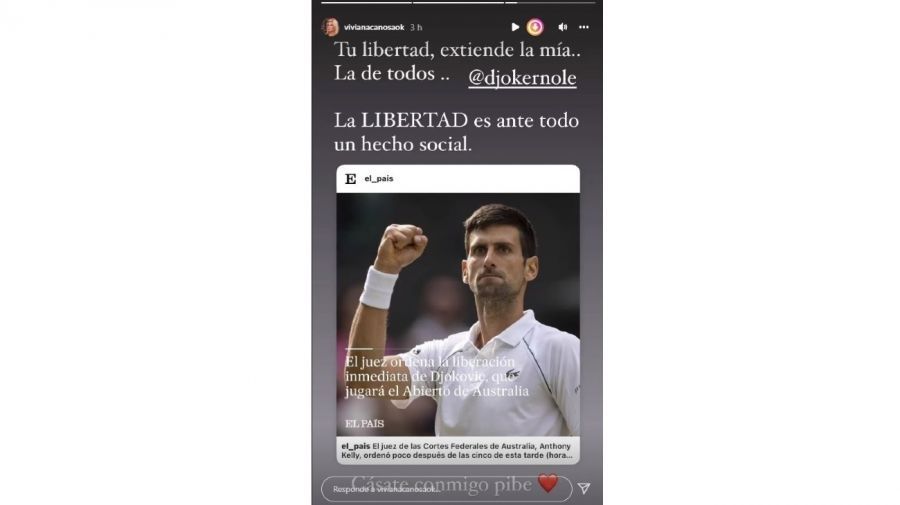 "Tu libertad, extiende la mía... La de todos, Novak Djokovic", compartió Viviana Canosa desde su cuenta de Instagram. Mientras que desde Twitter, la periodista siguió en su línea de apoyo a la decisión del tenista de no vacunarse con un mensaje que decía: "Me caso con vos".