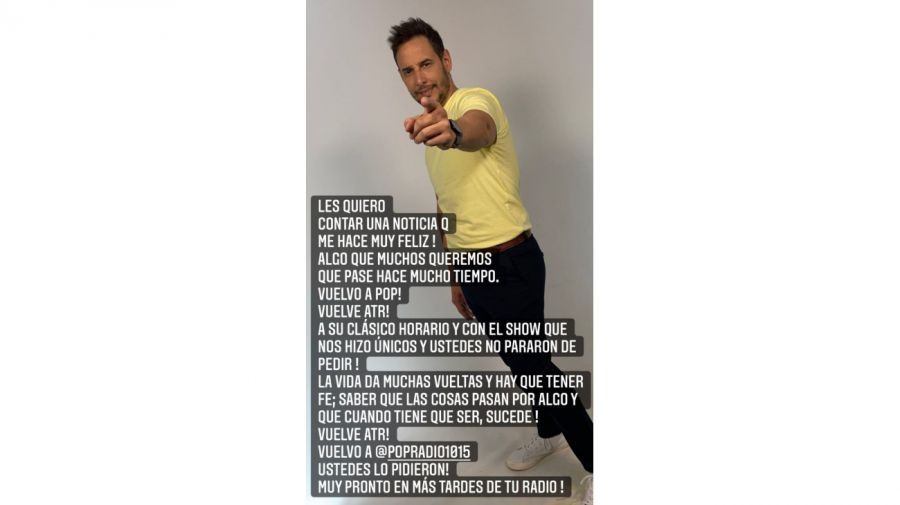 “Les quiero contar una noticia que me hace muy feliz! Algo que muchos queremos que pase hace mucho tiempo. Vuelvo a Pop! Vuelve Atr! A su clásico horario y con el show que nos hizo únicos y ustedes no pararon de pedir! La vida da muchas vueltas y hay que tener fe, saber que las cosas pasan por algo y que cuando tiene que ser, sucede! Vuelve ATR! Vuelvo a @popradio1015 ustedes lo pidieron! Muy pronto en más tardes de tu radio!”, escribió Rodrigo Lussich en una de sus historias de Instagram.