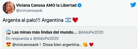 “Argentina al palo!!! Argentina”, escribió la periodista en Twitter frente a un comentario que decía “diosa bien argentina”.
