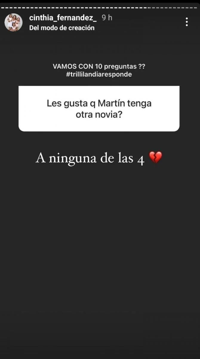 Sin embargo, un fanático le preguntó sobre su ex Martín Baclini y ella no sólo que respondió al cuestionario sino que la misma fue publicada en la sección de stories. “¿Les gusta que Martín tenga otra novia?” se mostró en el recuadro de la imagen. Contundente con su comentario, Cinthia manifestó: “A ninguna de las 4”.
