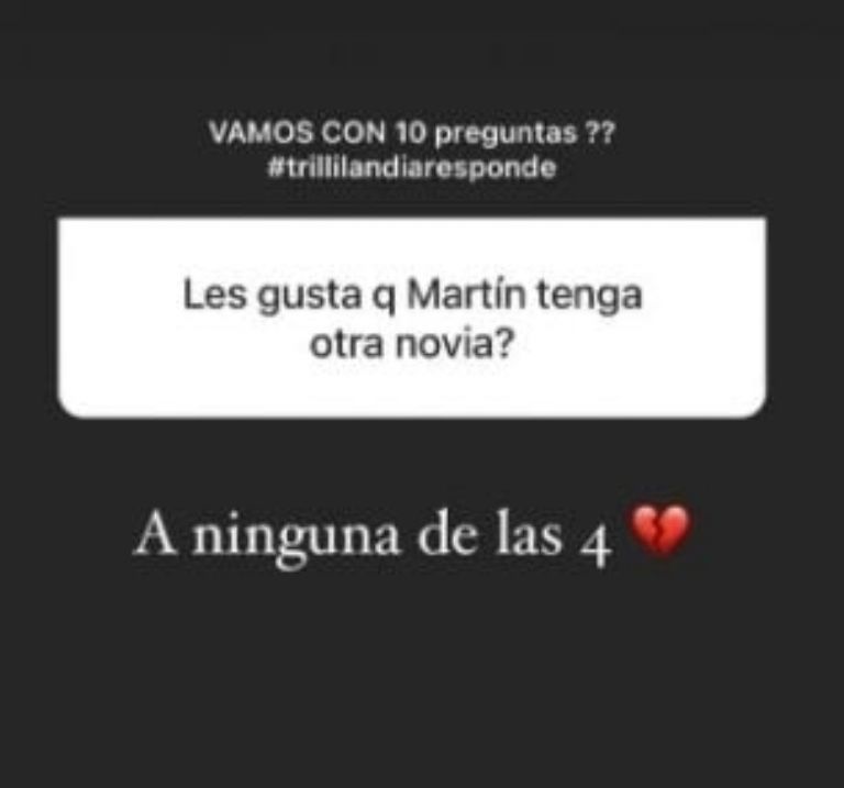 Un usuario le escribió a Fernández: "¿Les gusta que Martín tenga otra novia?". Lejos de acudir a una concepción protocolar, Cinthia exclamó con total sinceridad que no le agrada en lo más mínimo al contar: "A ninguna de las cuatro". En referencia a ella y sus tres pequeñas.